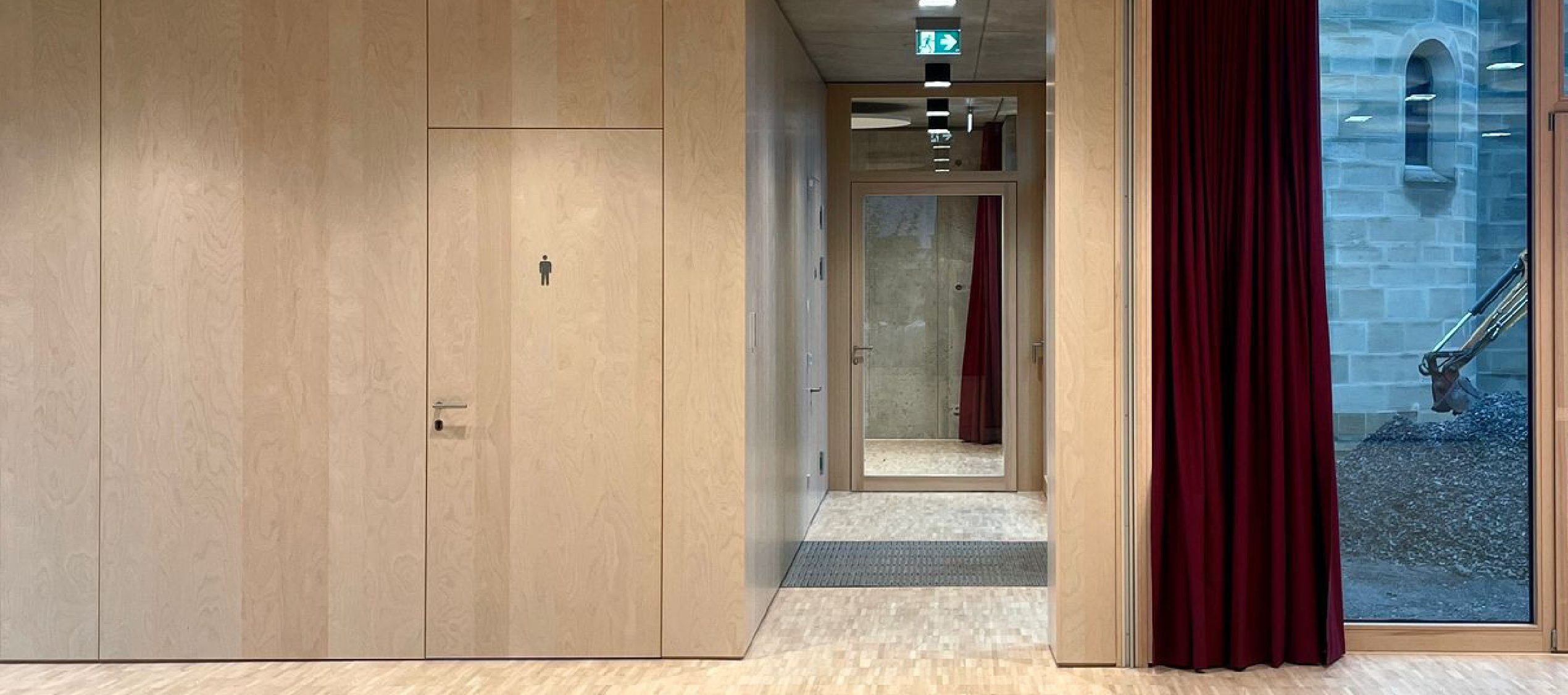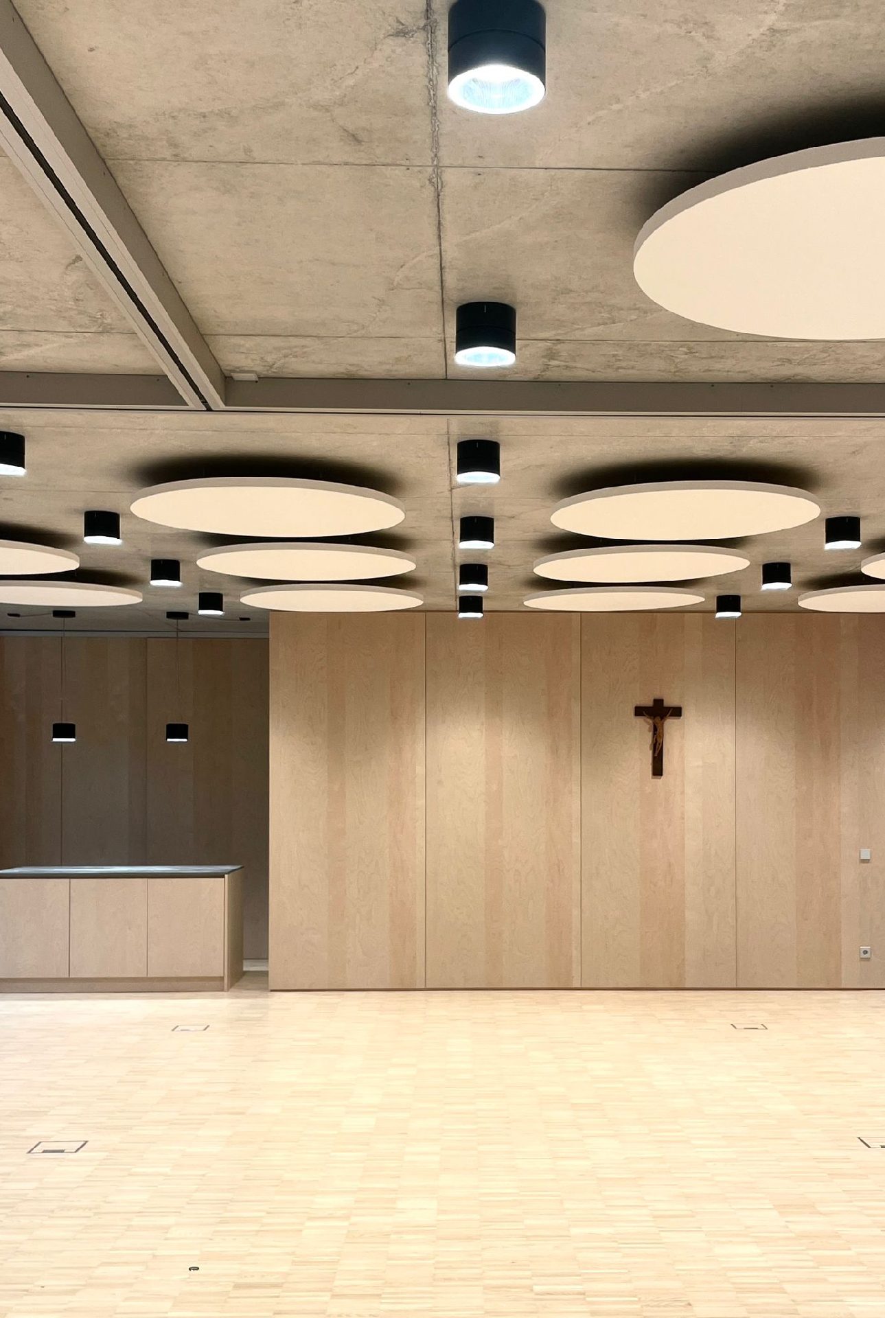 Flächenbündige Objekttüren und eine raumhohe Schiebetür sind passgenau in die Holzflächen integriert und unterstreichen die homogene Gestaltung. Mobile Trennwände ermöglichen flexible Nutzungsmöglichkeiten, ohne die gestalterische Klarheit zu beeinträchtigen. Die Teeküche fügt sich nahtlos in das Gesamtkonzept ein. Runde Akustikelemente an der Betondecke verbessern die Raumakustik und setzen zugleich dezente Akzente.