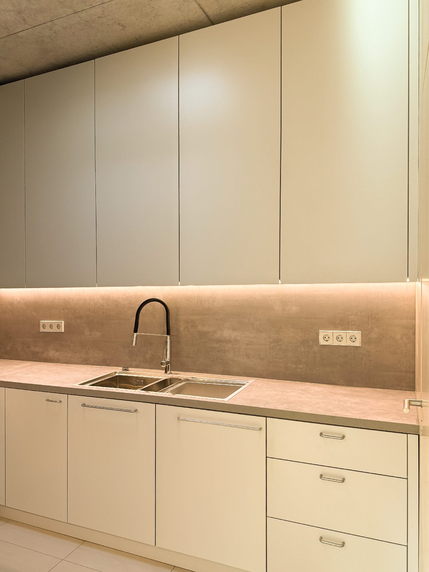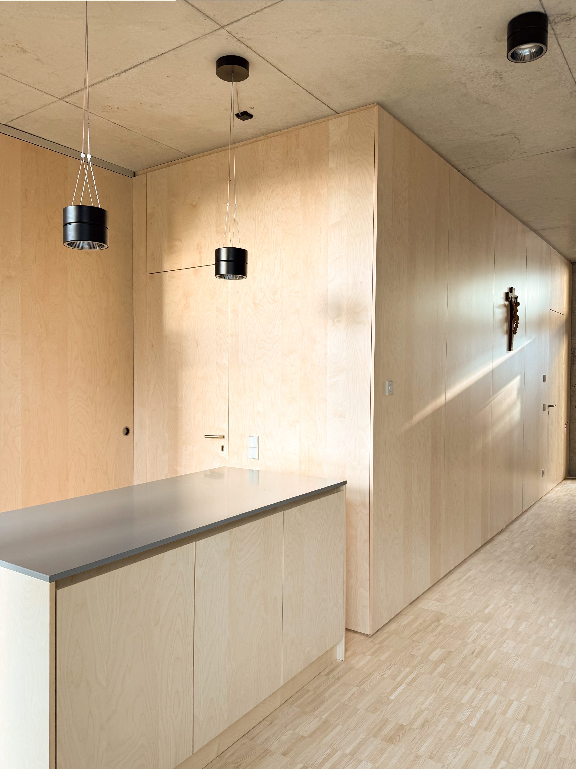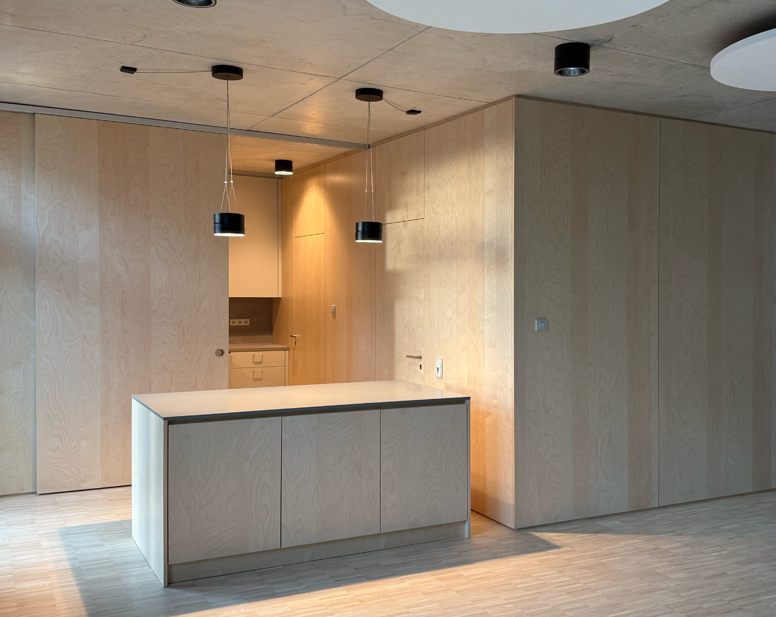 Maßgefertigte Holzoberflächen, präzise integrierte Einbauten und ein konsequent durchgängiges Materialkonzept prägen diesen Innenausbau. Wände sowie Sanitär- und Technikkerne wurden in Trockenbauweise realisiert und mit individuell gefertigten Birkenholzverkleidungen gefasst, die dem Raum Ruhe und visuelle Kontinuität verleihen.