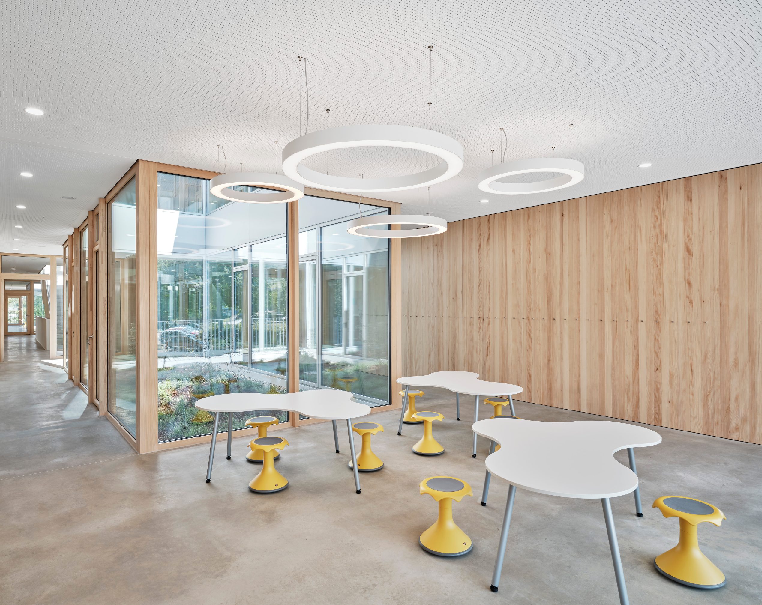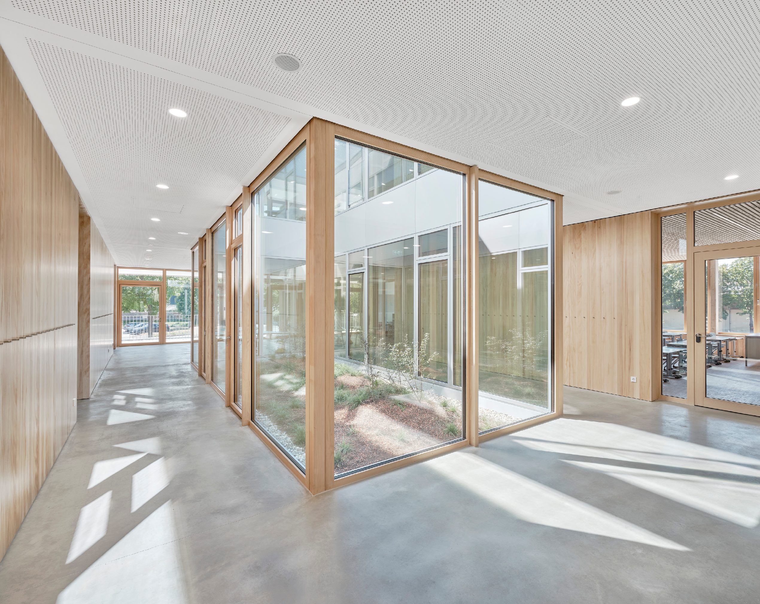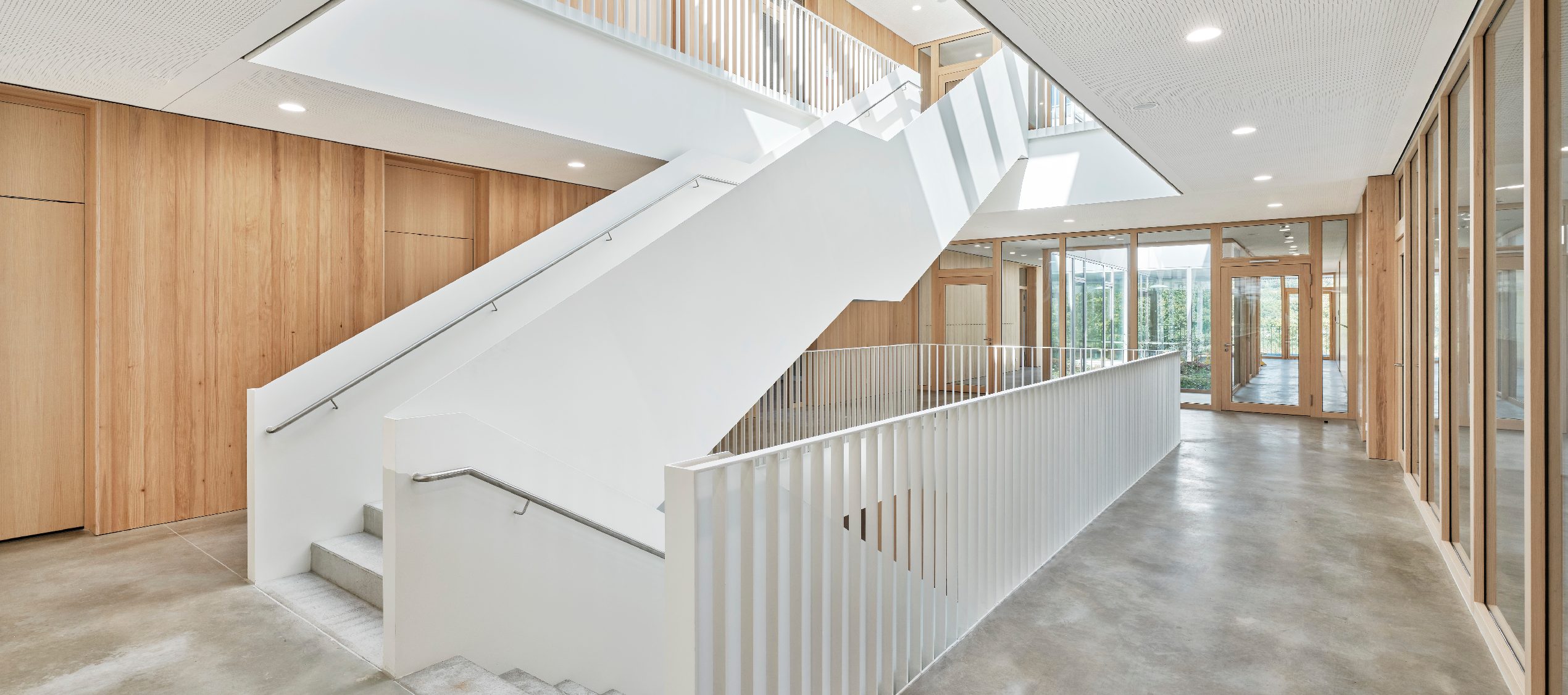 Auf rund 1.000 m² realisierten wir eine hochwertige Wandverkleidung aus Weißtanne-Täfer mit Nut und Feder. In den Brandabschnitten kam die Ausführung in B1-Qualität zum Einsatz. Die raumhohen Türleibungen wurden wandbekleidend mit Sturzbrett und durchlaufender Schattenfuge ausgeführt. Fensterbänke aus Multiplexplatten mit Weißtanne-Echtholzfurnier ergänzen das Gesamtbild. Alle Oberflächen erfüllen die NBBW-Anforderungen (VOC < 100 g/L) und überzeugen durch einen natürlichen Holzeffekt bei mattem Glanzgrad G05.